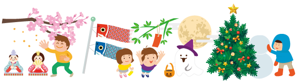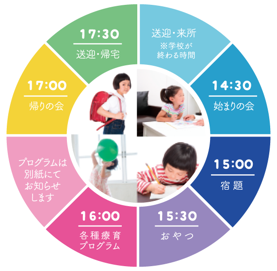 1日の流れ※日によって異なります。 からだを動かしたり心の学びをする場として、まずはお気軽にご相談ください。 季節の行事 ※各曜日、学校がお休みの日の時間割は別紙にてお知らせいたします。 ※外出行事等につきましては別途事業所よりお知らせいたします。